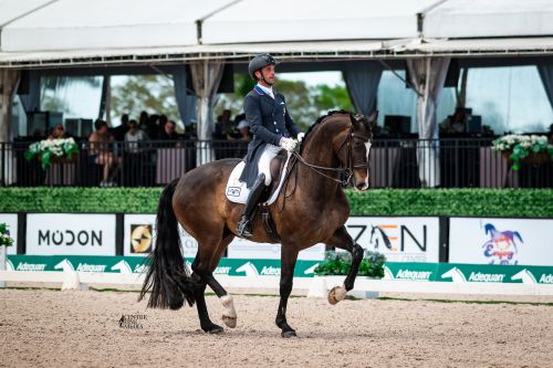 Wellington, Fla. – March 21, 2026 — Jordan LaPlaca threw his arms in the air and hugged Gold Play after their final salute in the Modon FEI Nations Cup CDIO3* Grand Prix Special. He was justifiably delighted with his own and Nancy Huton’s 11-year-old, for the Grey Flanell x Sir Donnerhall II gelding had just sealed a double of gold medals for LaPlaca on the U.S. rider’s senior team debut. Their individual glory followed team gold on Thursday of Week 11 at the 2026 Adequan® Global Dressage Festival (AGDF) in Wellington, FL.